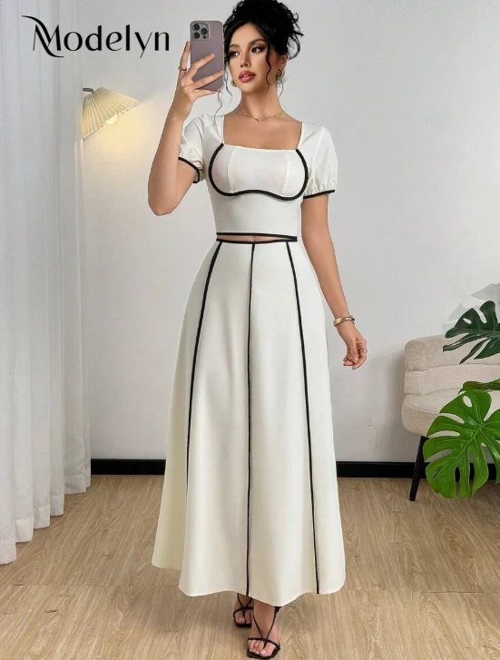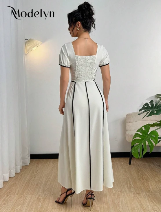 مجموعة قطعتين من فستان مناسب للنساء ذو ياقة مربعة وأكمام قصيرة مزين بلونين متباينين