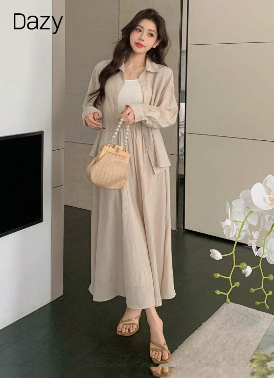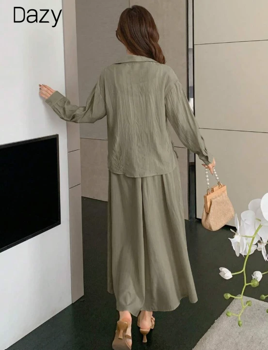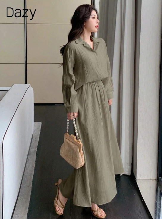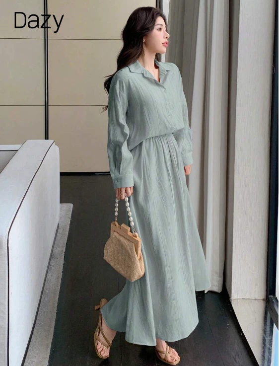 مجموعة قميص وتنورة قصيرة بلون أساسي بأكمام طويلة للنساء، ملابس خريفية، ملابس للعودة إلى المدرسة، 2 قطعة