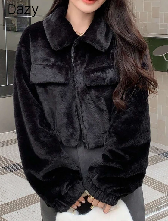 Women's Long Sleeve Solid Color Feather Short Jacket with Velvet Collar Autumn Winter