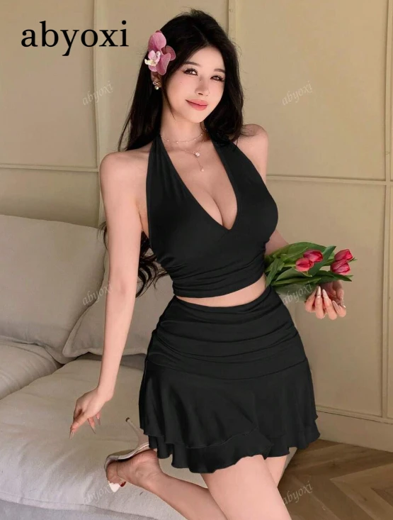 طقم قطعتين من التنورة والصدرية القصيرة باللون الزهري، قصيرة بخصر كروبد وياقة عنق عالية وذات جانب ملفوف، ذات ظهر مفتوح، نمط جريء وأنيق ومناسب للفتيات الشابات، ملابس نسائية عصرية جديدة