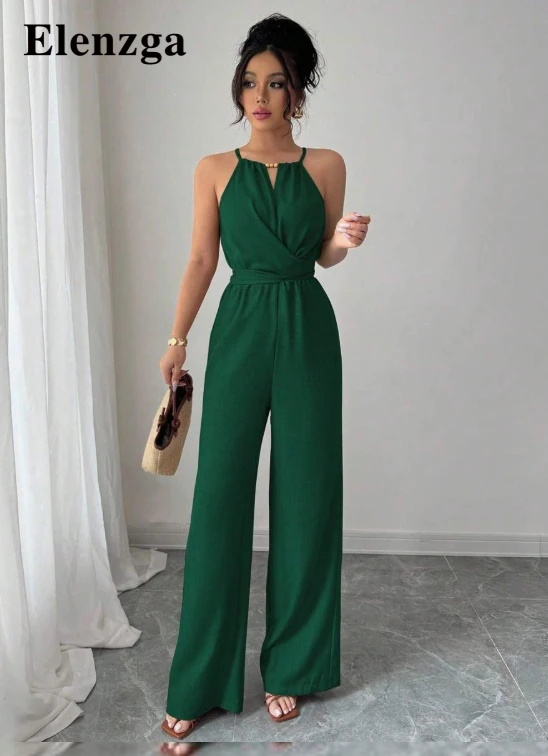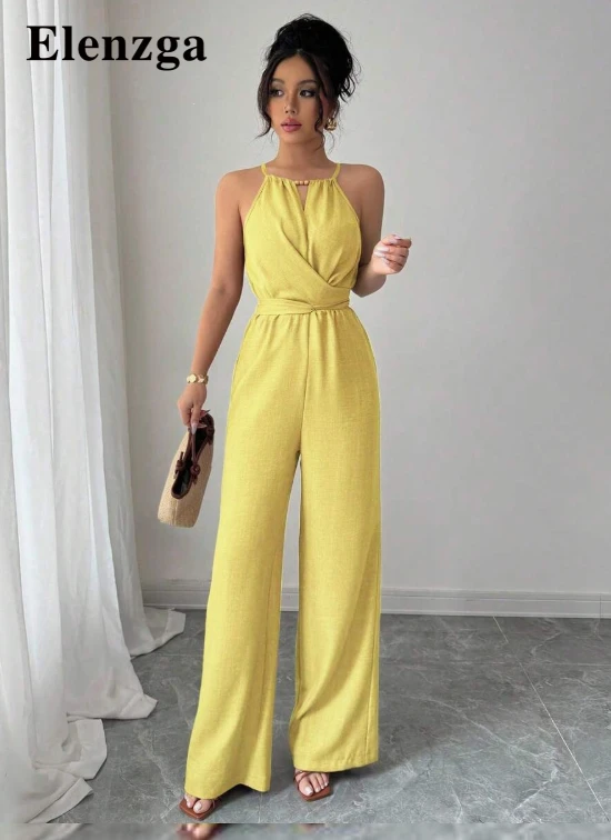 قفطان نسائي كاجوال من قماش الخاكي المتجعد، تصميم حمالة رقبة مزين بالخرز عند الخصر وأزرار للربط، ملابس صيفية