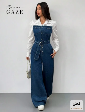 جمبسوت نسائية ذات لون أزرق قطعتين تأتي مع حزام وبنطال ذو ساق واسعة للربيع والصيف